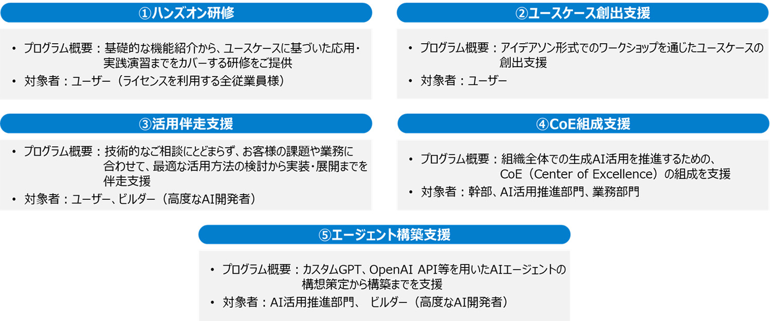 お客さまのAI活用戦略に沿った支援を通じて、AI活用拡大を後押しします。プログラムメニューは、お客さまの状況に合わせてご選択いただけます。ご要望に応じたカスタマイズにも対応いたします。