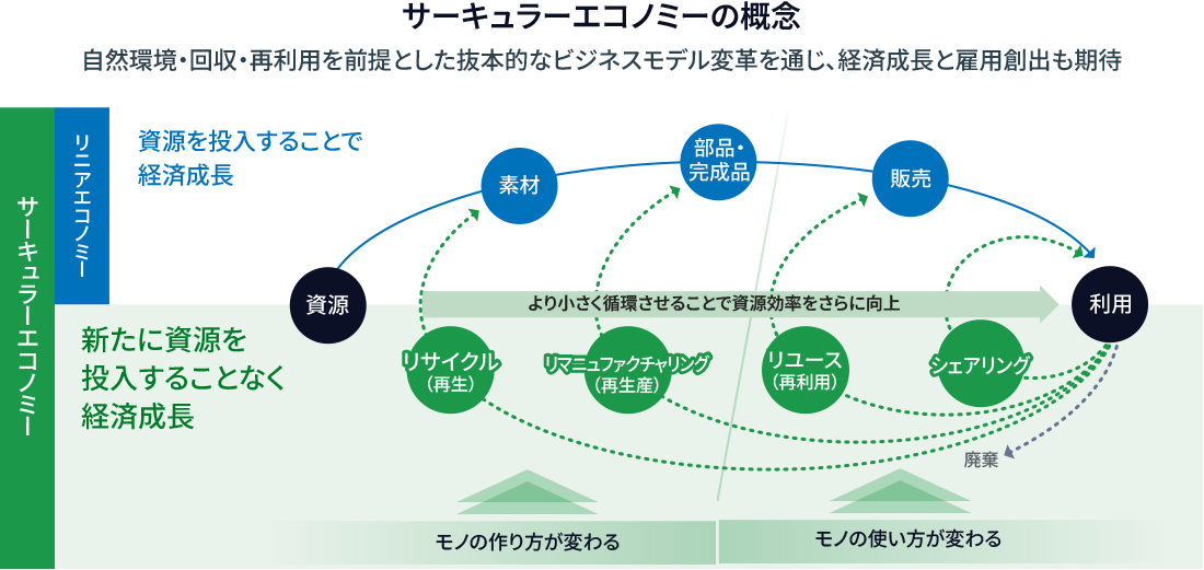 低環境負荷のものづくりへの転換は、”新たに資源を投入する量を極小化し再生産を行う”サーキュラーエコノミーのアプローチが有効です。