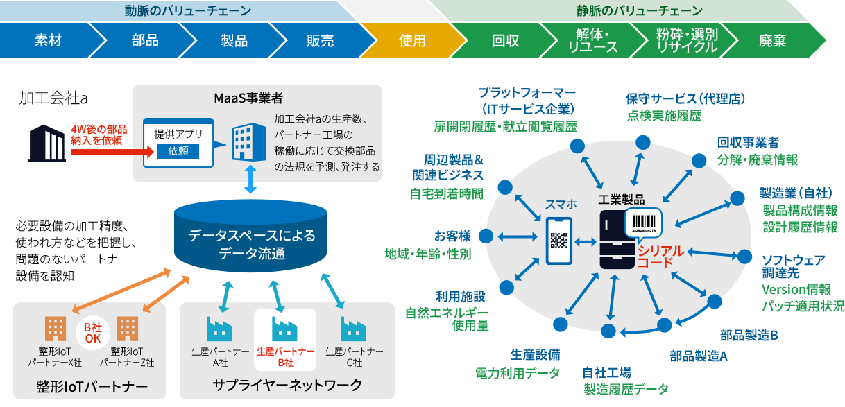 競争力のある環境価値を創出するためには、モノを作る「動脈」と、モノを使う・集める「静脈」からなる動静脈のバリューチェーンを構成し、実測値を生み出す工場の機器や都市機能との情報連携と流通が必要となります。