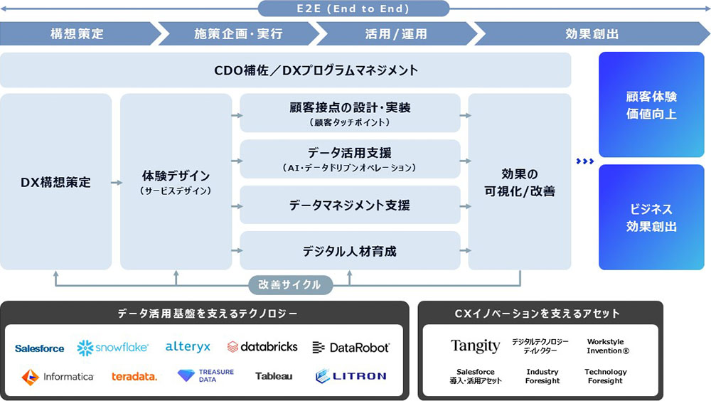 顧客体験(CX)向上に求められる要素を網羅し、DX構想から効果創出まで、お客様業務におけるEnd-to-Endで一貫してご支援します。