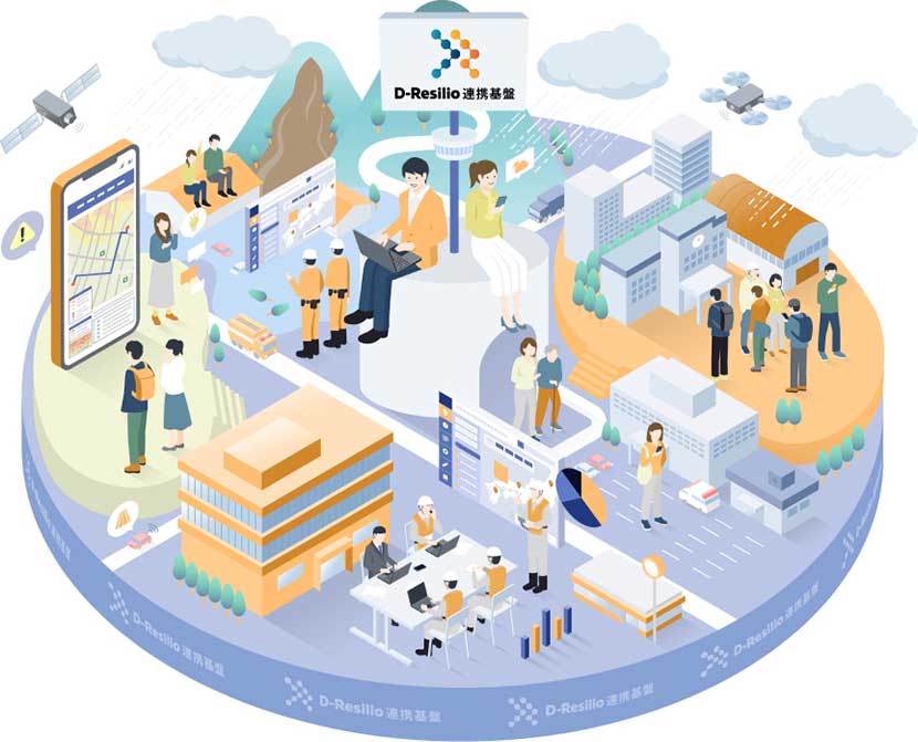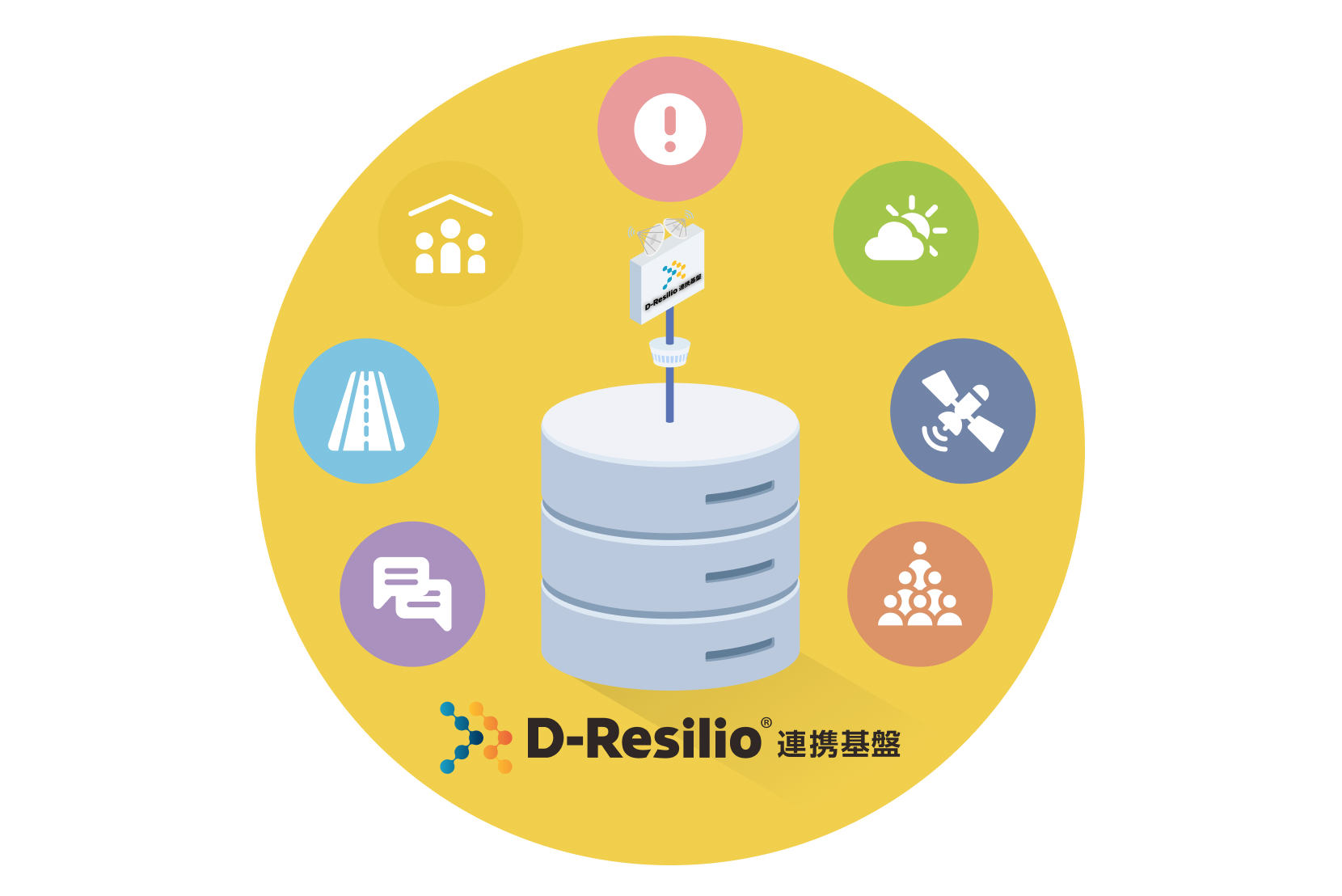 D-Resilio連携基盤は、様々な企業と共創して実現した、災害リスク情報を集約する災害情報連携基盤です。