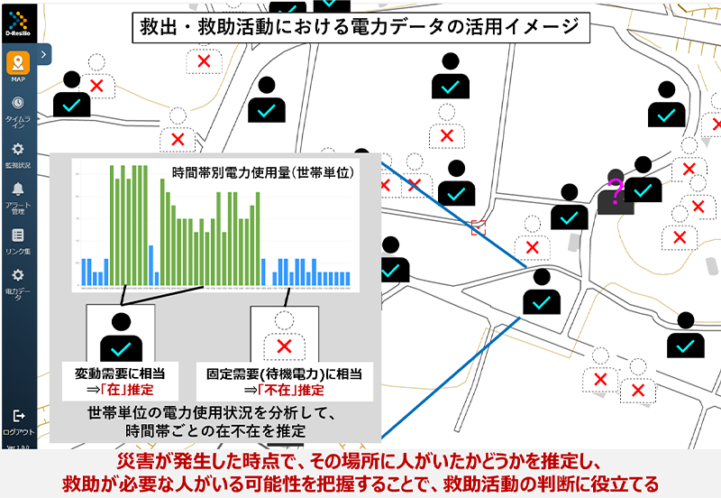 各世帯に設置されたスマートメーターより取得した電力使用量データを、在宅状況の推定や居住実態の確認など、災害対応業務に有効な形に加工して提供します。