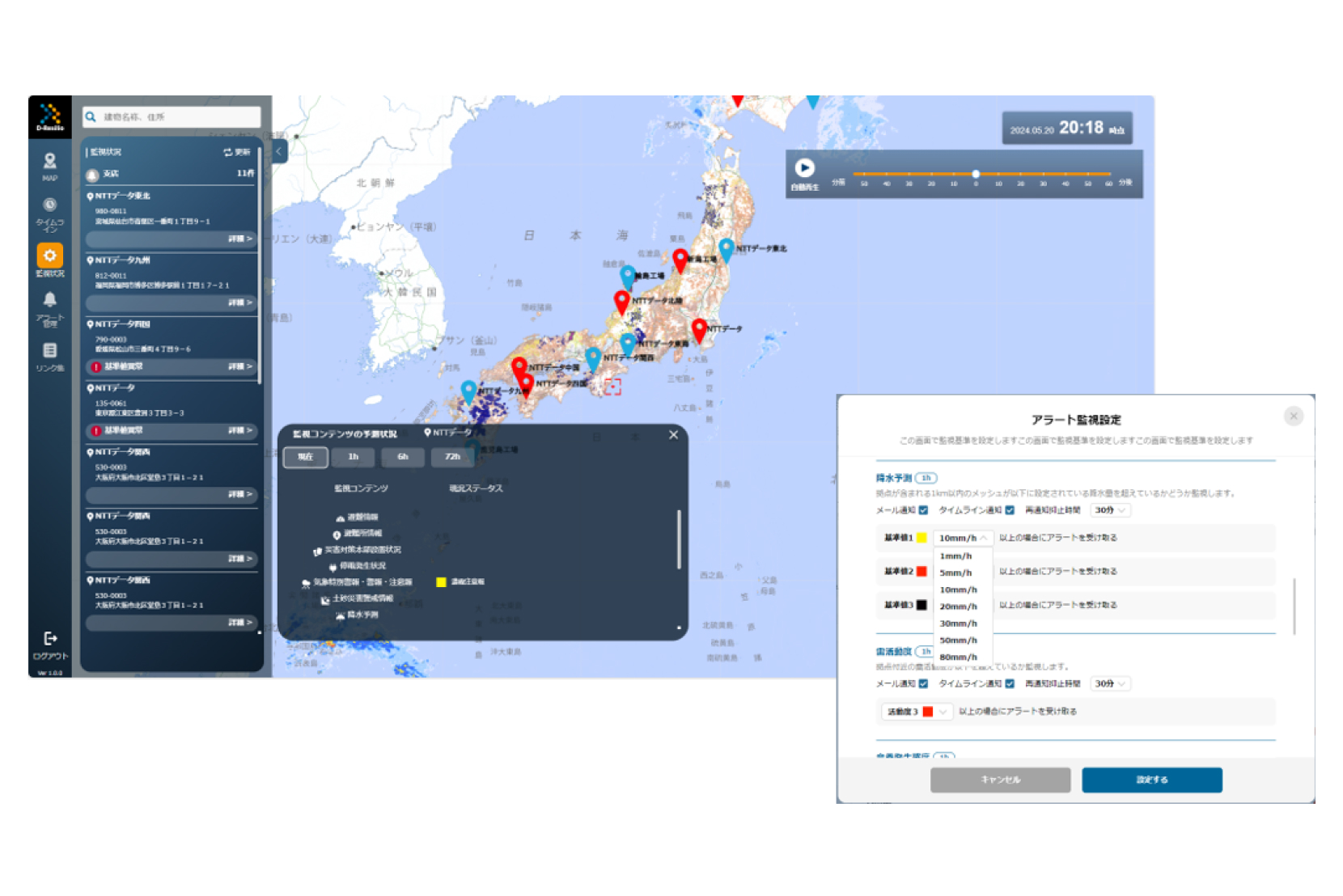 気象庁から発出される高解像度ナウキャストや浸水害・土砂災害危険度分布など、各種気象情報です。 リアルタイムの気象情報から72時間先の降水予測情報まで幅広く気象情報を取り扱います。