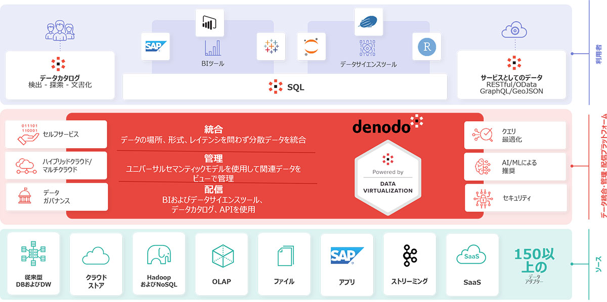 Denodo Platformは、サイロ化したシステムを論理統合し、企業内に分散したデータの一元管理を可能とします。より鮮度の高いデータ活用で分析スピードを高め、経営判断の俊敏性向上に貢献します。Denodoの仮想ビューはリアルタイムなデータアクセス、社内外のデータとの柔軟な組合せによりデータの価値を見出せます。またローコードで仮想ビューが作成でき迅速なデータカタログの提供・拡張を実現します。