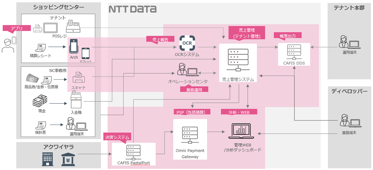 ショッピングセンター様のバックオフィス業務(売上報告、現物管理、売上チェックなど)をNTTデータが徹底的なデジタル技術を用い、サポートします。