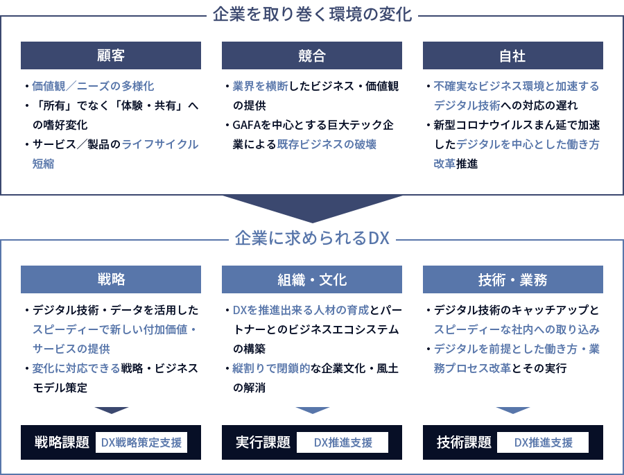 | 何をDXすれば良いのかわからない | DXの目的を明確化 | お客さま内のDXに対するコンセンサスを形成するため、お客さまの経営方針および事業戦略に基づき、実施すべきDXの目的を明確化します | |