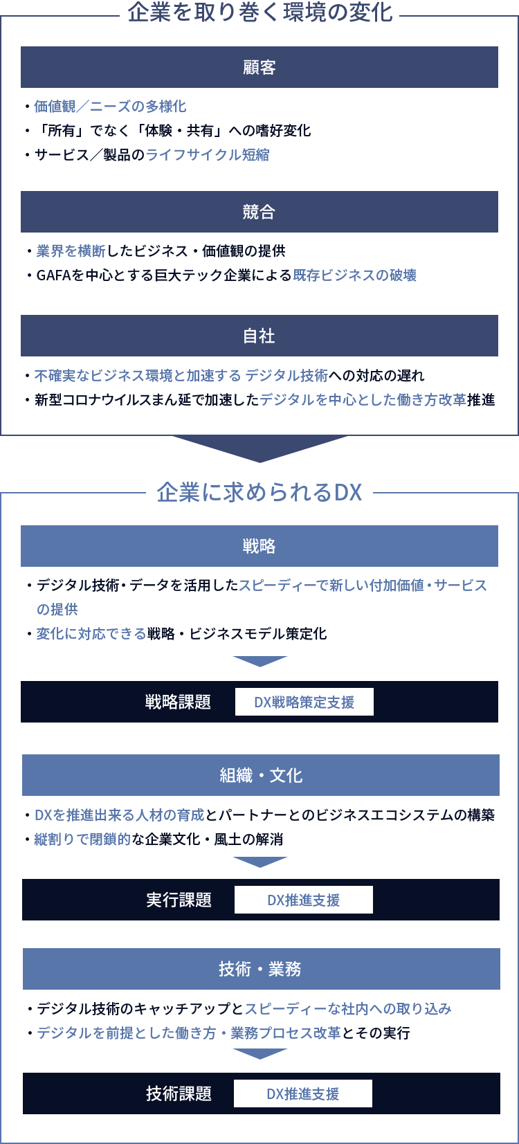 お客さまに求められるDXの各課題についてデジタルテクノロジーディレクターがDXディレクションを実施し、お客さまの変革を阻む課題を解決します。