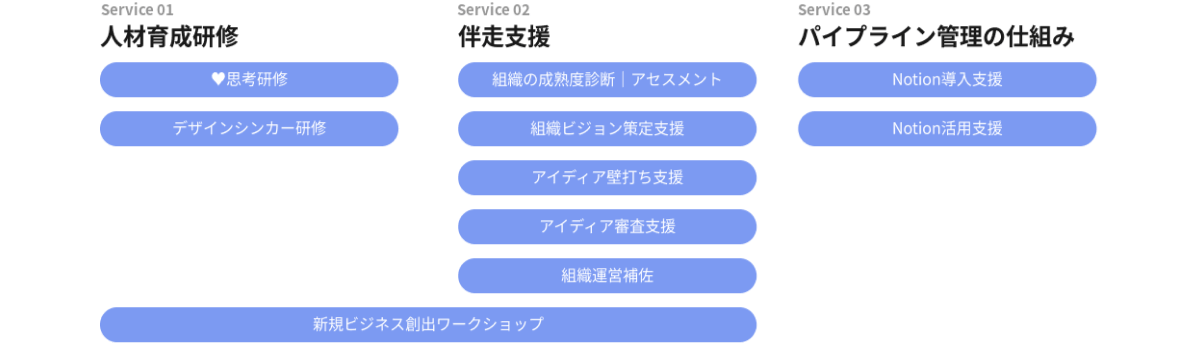 willとは自分の作りたい世界や解決したい課題への熱意・やる気のことです。新規ビジネス創出活動を行う上で、「これくらいでいいだろう」という心がない状態では新規ビジネス創出は上手くいきません。自分なりの「こうあるべき」「こうしていきたい」という心が込められた状態で進めることで新規ビジネス創出の成功確率が上がります。まだ、willがない人でも大丈夫です。一緒にあなたのwillを見つけて育てていきましょう。 また、本研修以外にも新規ビジネス創出に関係する研修を複数用意しています。