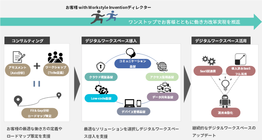 「WorkStyle Invention」はワークスペースのモダナイズに関するコンサルティングから、ツール導入/利用促進までを一気通貫で対応するトータルサービスです。