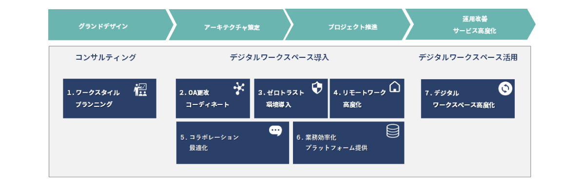 従業員の日常業務を支えるOAインフラサービスのモダナイズに向けたグランドデザイン策定から構築・以降までトータルコーディネートを実施します。
