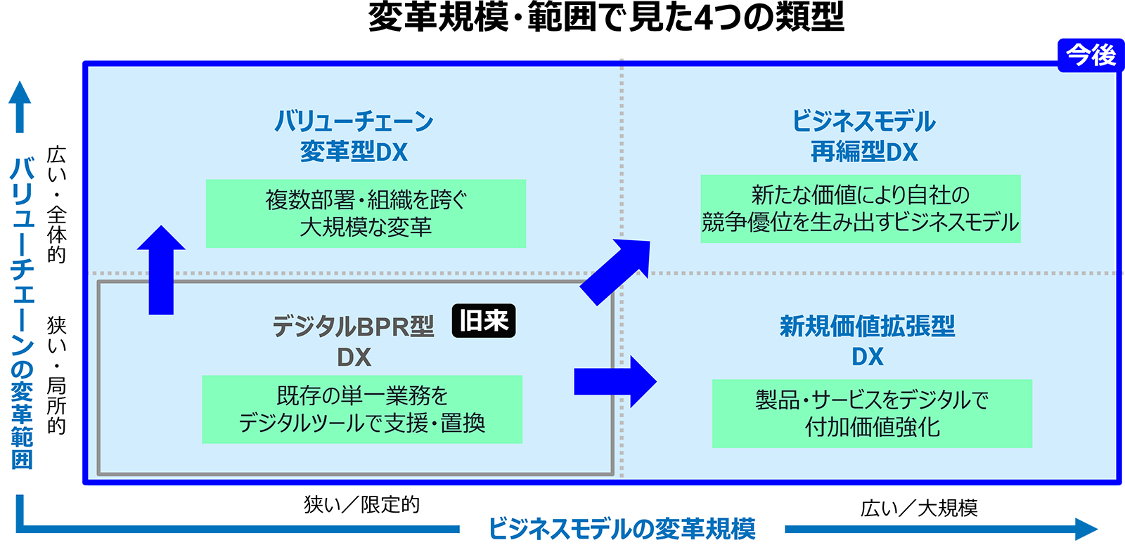 現状、多くの日本企業が狭義のDX(デジタルBPR型DX)にとどまっています。さらなるDX推進に必要なのは、大きな経営インパクトが期待できるバリューチェーン変革やビジネスモデル再編をDXを用いて実行することです。私たちNTTデータは、DX組織に求められる新たな価値創造という挑戦課題に共に取組み、デジタル活用による事業変革を実現することを使命とし、DXによる成果創出と組織・人材の課題解決を支援します。