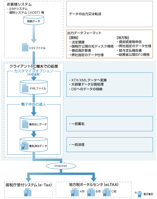 法人企業や金融機関が行っている大量の法定調書等や給与支払報告書・償却資産申告書などの電子申告を、効率よくスムーズに実現するサービスです。マイナンバーを踏まえた運用も可能となっており、また既存システムで保有する申告・申請データを利用しますので、大きな改修することなく導入することができます。