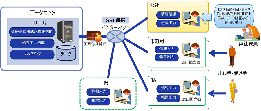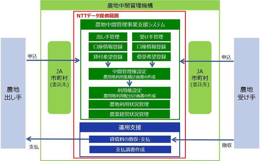 農地および農地の貸付人・借受人の管理、中間管理権の設定、賃借料の徴収・支払対応などのデータ管理や運用を、都道府県に所属する農地中間管理機構様および委託先組織を通じて効率的かつ一元的に行うことができます。