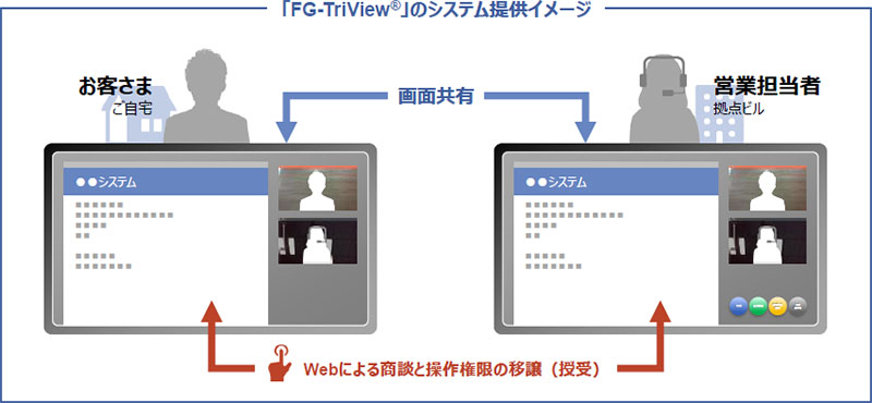 FG-TriViewは現在ご利用中の業務システムやサービスを画面共有しながら、ゲスト側へ操作権をシフトして電子署名や契約手続き操作をいただくことにより、リモートでの契約締結までを実現できるソリューションです。