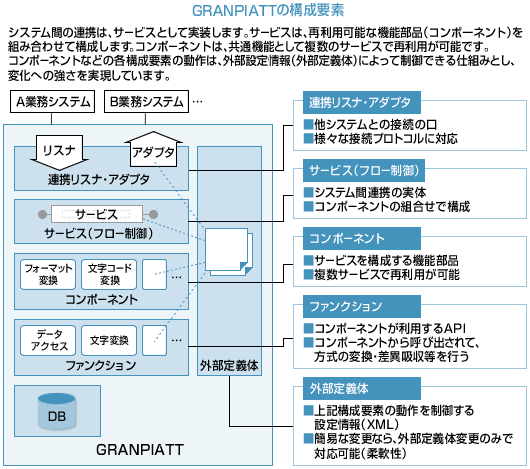 他ESBツールと異なり、自治体情報システム整備に必要となる共通機能をコンポーネントとして実装しています。特にマルチベンダ環境に有効なデータ変換機能(文字コード、フォーマット、レイアウト)を有しており、導入済み団体にご活用いただいています。共通機能は再利用性により層別しており、多目的・多分野での利用も可能です。