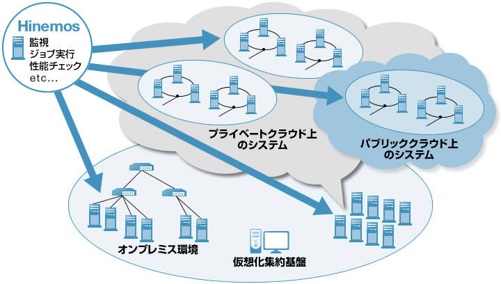 - オンプレミス、プライベートクラウド、パブリッククラウドと異なる環境をまとめて一元管理できます。