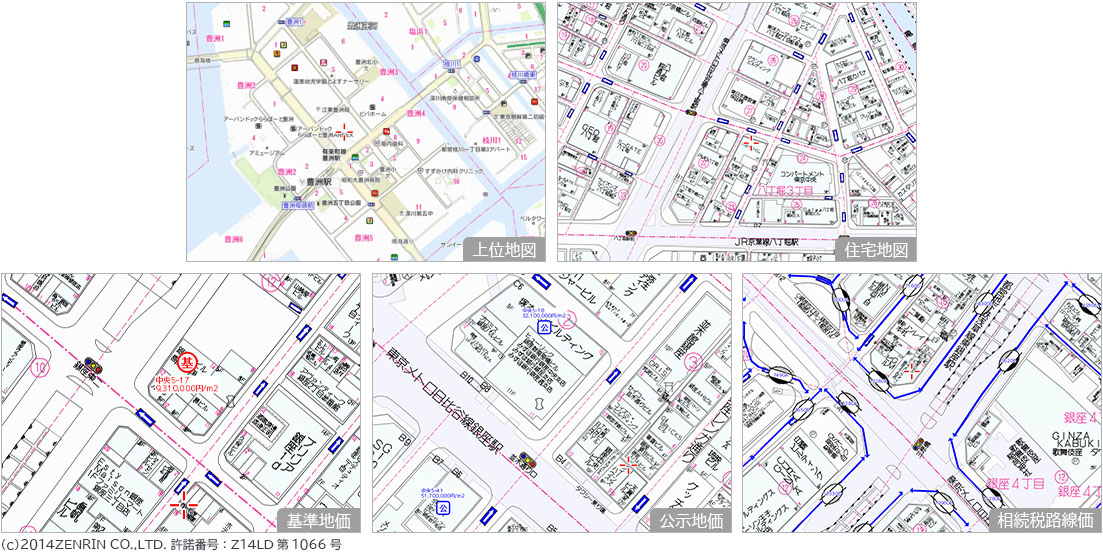 本サービスでは上位地図、住宅地図、公示地価、基準地価、相続税路線価の5つのコンテンツを提供いたします。