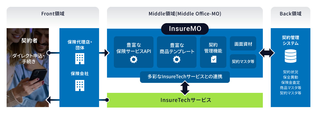 InsureMOは、迅速性・多様性が求められる顧客接点のFront領域と、