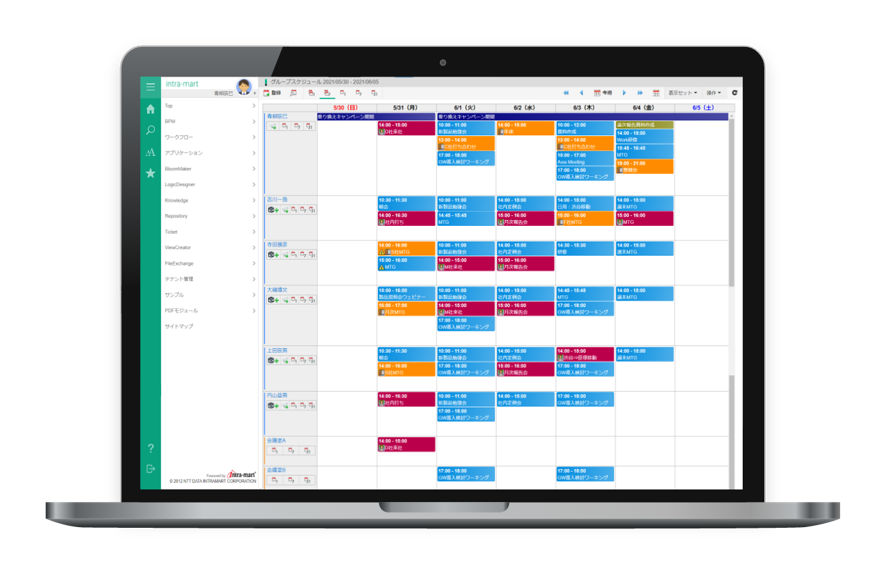 個人、グループメンバー、上司など、社内メンバーのスケジュール状況を一目で把握することができ、全社向けの周知事項から自分自身のタスク管理まで、日常業務に欠かせない幅広い業務をサポートします。また、スマートフォンにも標準対応しています。