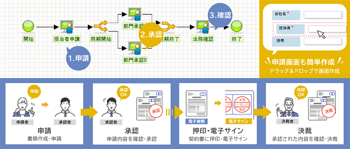 申請・承認などの業務プロセスを素早くデジタル化する、システム共通基盤型ワークフローです。他システムとの連携のほか、グローバル含めた全社利用から個別業務のフローまで、幅広い活用が可能です。