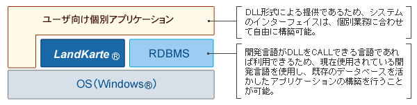 LandKarteは、GISに必要な機能をDLLで提供します。DLLをCALLできる言語(Visual Basic®,Cなど)を用いて使用でき、既存の開発言語環境やノウハウ、データベース資産を活かした自由なシステムの作り込みが可能です。