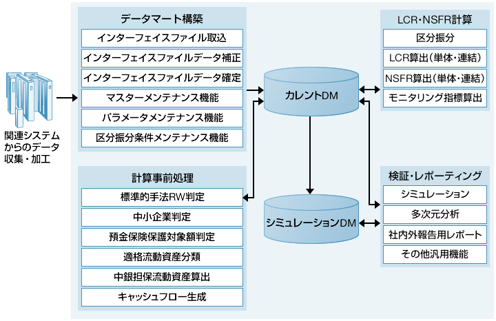 バーゼルIII流動性規制に対応したLCR(流動性カバレッジ比率)やNSFR(安定調達比率)を算出する、金融機関向けシステムです。分類方法や定義、掛け目設定を可能な限りパラメータ化し、今後の規制変更にも耐えうる柔軟性を実現。キャッシュフロー生成機能を有し、上流システム側でのデータ準備負荷の軽減を図っています。