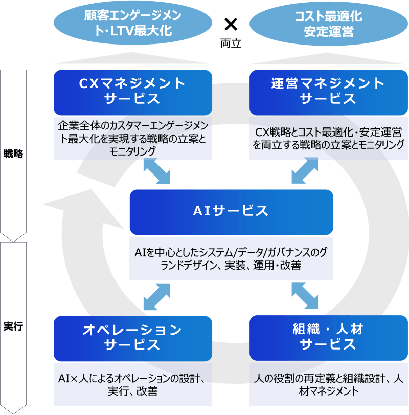 LITRON Customer Engagementは、組織戦略の立案から実業務に応じたAIエージェントの開発、AIエージェント活用を前提とした最適な組織・体制の構築、オペレーションの実行など幅広くお客さまを支援します。