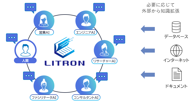 本サービスは生成AIに個別の立場(ペルソナ)を設定し、生成AI同士がコミュニケーションし、