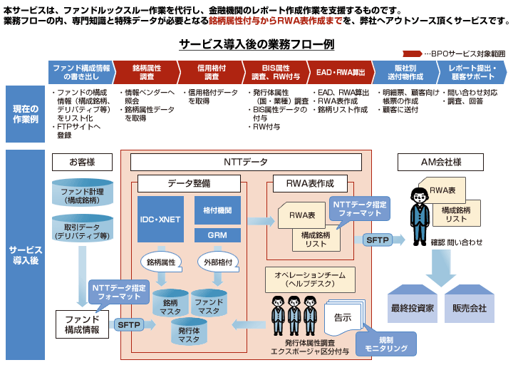 銀行が保有するファンドのリスク計測・レポーティング業務を支援するサービスです。バーゼル規制の厳格化に伴う業務負荷の増大に対応するサービスとして、システム化による大量データの高速処理に加え、複雑な判断を高度な専門知識を有するオペレーションチームで補完することにより、正確なレポートを迅速に作成します。