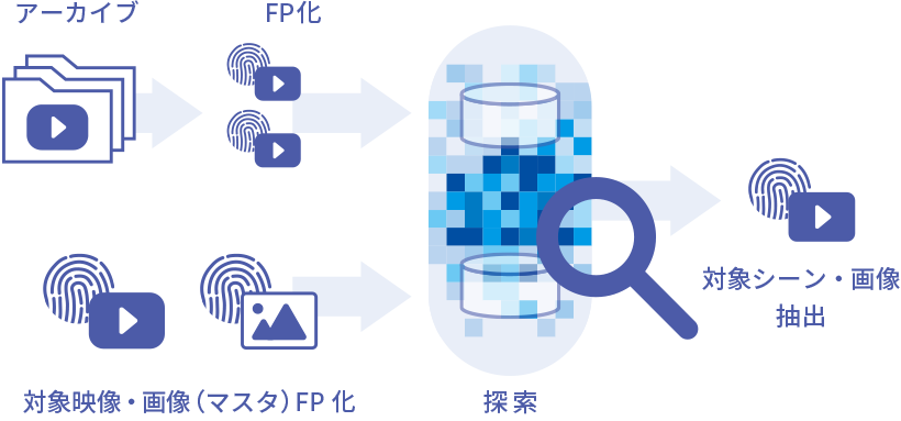 - 特定の画像やシーン映像を特徴データ化、膨大なアーカイブの中から該当の画像やシーン映像が使用されているコンテンツを特定