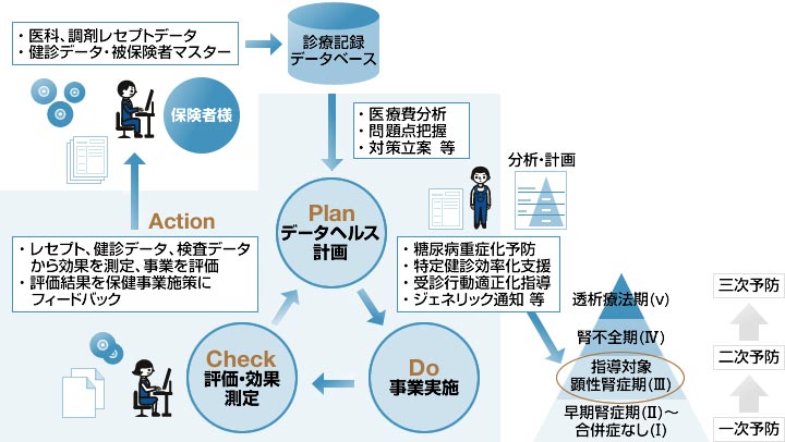 • 医療費分析、医療機関受診勧奨、糖尿病性腎症の重症化予防、頻回受診・重複服薬等の適正化、特定健診受診勧奨などの医療保険者による保健事業(データへルス)