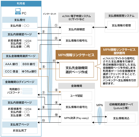 - 支払金融機関選択画面の構築が不要 情報リンク方式を導入するためには、利用者が支払を行うために金融機関を選択する画面が必要になります。MPN情報リンクサービスでは各収納機関に対して支払金融機関ページを作成し提供しますので、収納機関システム側で当機能を構築する必要がありません。