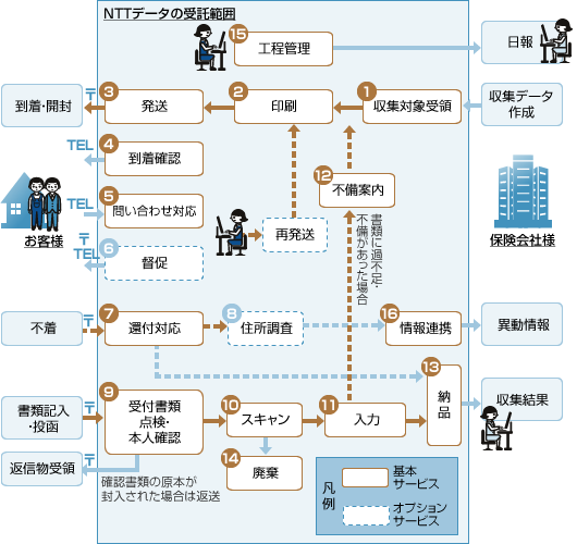 生命保険会社様および損害保険会社様向けのマイナンバー収集に関するBPOサービスです。保険契約者、保険金受取人、代理店等に対してマイナンバー(個人、法人)の申告依頼書を送付。返送された申告書を受け付け、点検した後、収集したマイナンバーを保険会社様に納めます。データを当社で保管することも可能です。