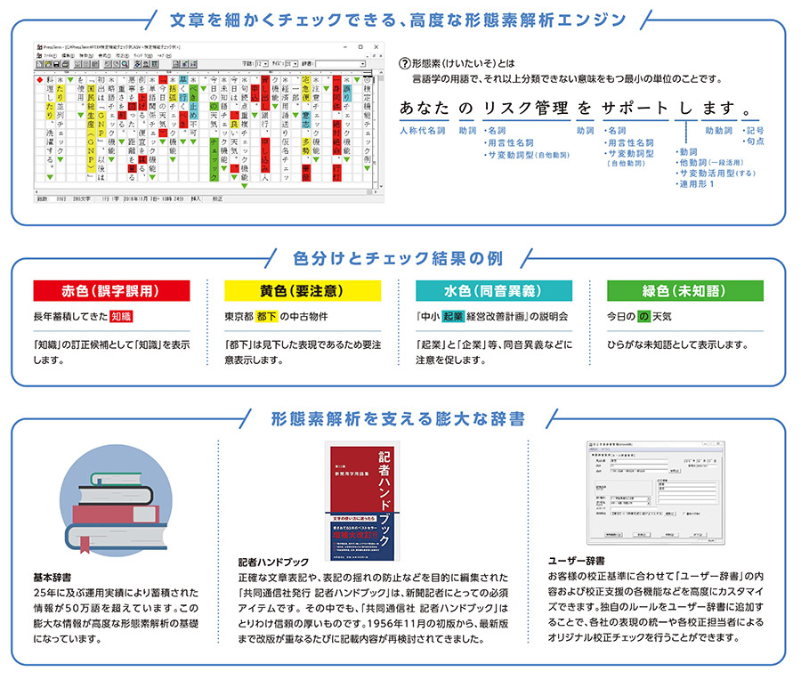日本語の文章を簡単な操作でスピーディーに校正作業を行うことができます。NTT研究所が開発した高度な形態素解析エンジンを搭載しており、日本語独自の文法や単語の情報を素早くチェックし、誤りのある箇所に対し「誤字誤用」「要注意」など、色分け表示します。さらに、「共同通信社 記者ハンドブック」の内容を標準搭載しているため、正確な文章表記に従って校正することができます。