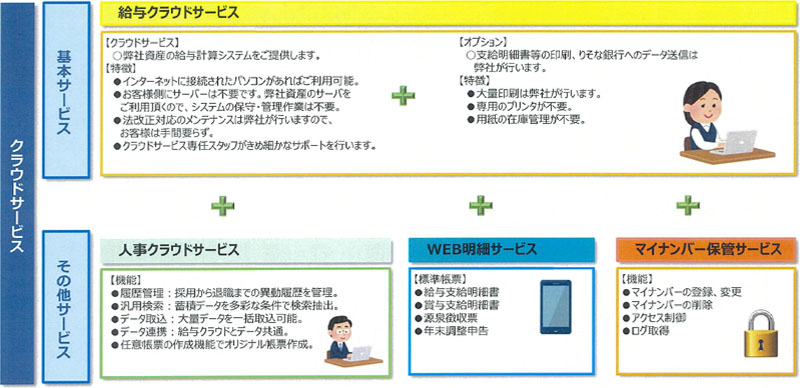 給与・賞与計算、給与台帳作成、年末調整計算、住民税改定、マイナンバー保管、人事管理などの業務が対象です。