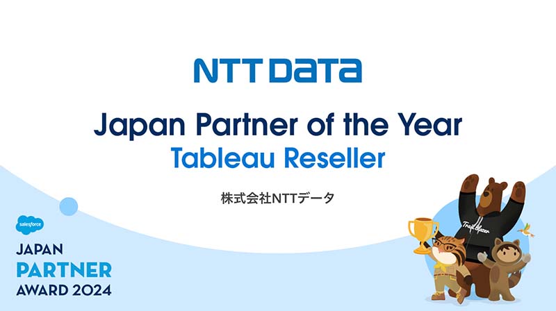 NTT DATAは、株式会社セールスフォース・ジャパン(以下:Salesforce)のTableau Partner Award 2023において、「Tableau Japan Partner of the Year」を受賞しました。同賞は、顧客のビジネス革新に最も寄与したパートナーに授与されるものです。