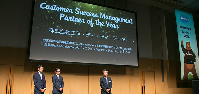 2018年5月29日(火)に開催された「Partner Summit 2018」にてNTT DATAは、長きにわたってお客さまとともに続けてきたSalesforceの活用・定着に向けた取り組みと前年比240%の成長を評価され、お客さまのビジネスの成功に最も貢献したパートナーとして「Customer Success Management Partner of the Year」を受賞しました。