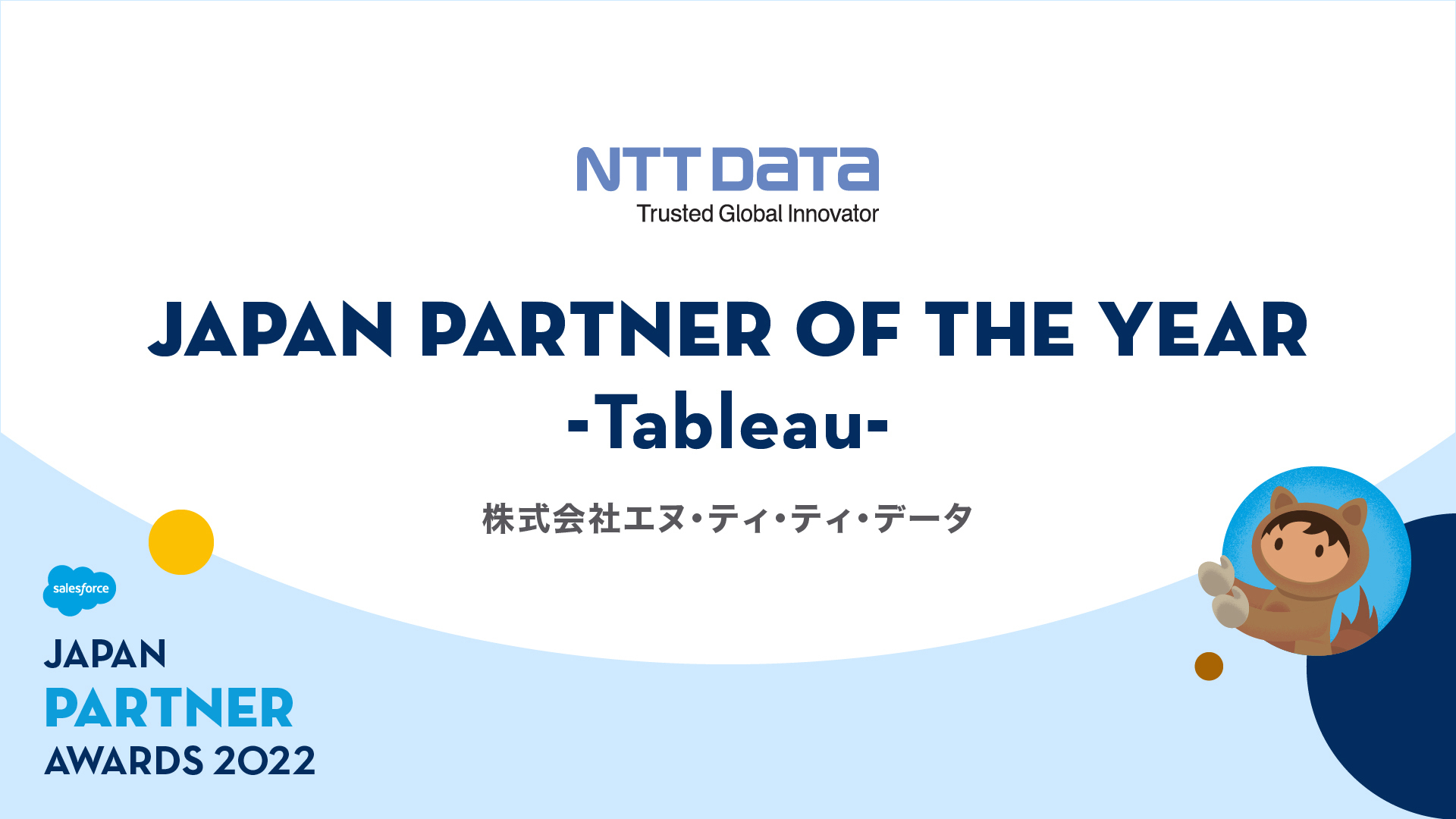 NTT DATAは、 セールスフォース・ジャパン社が、国内 500 社以上のパートナー企業から、この1年で特に優れた成果や実績を挙げた企業に授与するSalesforce Partner Award 2022において、Japan Partner of the Year -Tableau- 賞を受賞しました。