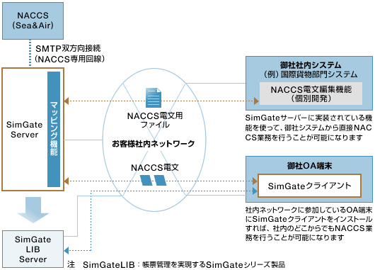 お客様が自社システムとNACCSをダイレクト接続する際に、一からゲートウェイを構築する必要がなく安価に実現することが出来ます。NACCSからの受信電文情報に関して、受信電文のコピーや配信先端末の設定等に自由度があります。そのため、社内の運用に合わせた利用が可能です。SimGateクライアントソフトウェアがセットになっており、Sea-NACCSおよびAir-NACCSの全業務に対応しています。そのため、お客様が独自で画面・帳票テンプレートを構築する必要がありません。このパッケージソフトはライセンスフリーで、何台でも制限なくお使いいただけます。