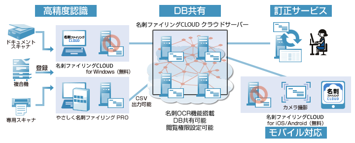 基本利用料0円(無料)のクラウド名刺管理サービスです。国内最高峰のOCR機能により、低コストで名刺の情報を資産に変えて、営業活動などに活用できます。面倒なシステム構築やメンテナンスも不要。お客様の環境に応じて、登録名刺枚数やユーザー数が選択可能なので、コストパフォーマンスに優れた運用が実現します。