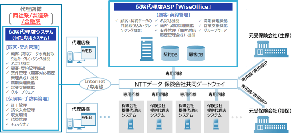 「WiseOffice2」は保険代理店業務に必要な顧客、契約、案件管理や営業支援のための機能が揃ったクラウドサービスとなります。生保・損保を問わず、保険会社から提供される契約データを自動的に取得し、顧客名寄せを行うことで、乗合保険会社各社の顧客・契約情報を一元管理することができるようになります。態勢整備に対する各種対応もサポートしており、オプションとして「お客様意向確認ナビ」を提供しています。