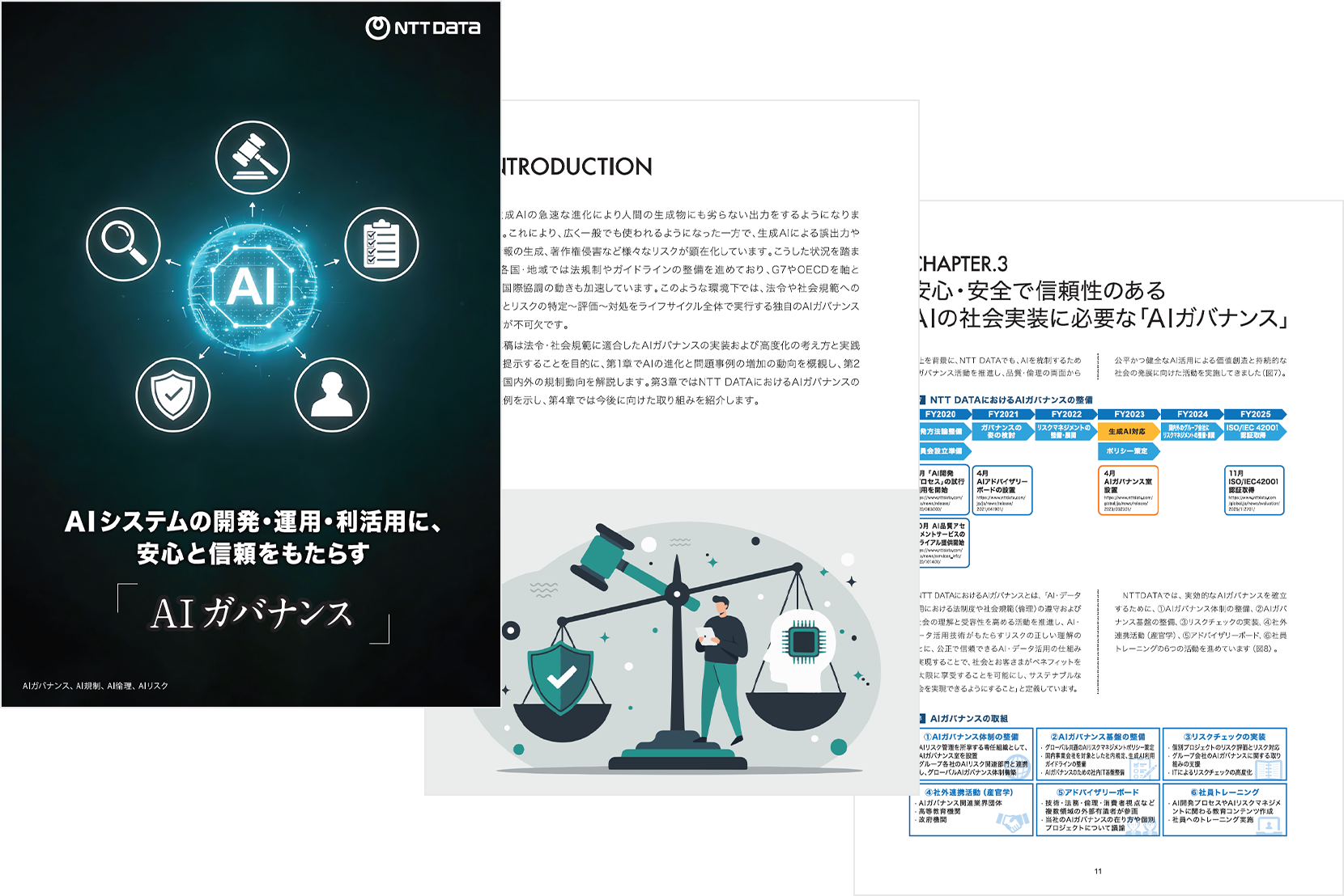 NTT DATAは、人間とAIが共生する「より豊かで調和のとれた社会」の実現に向けて、政府が主導するAIガバナンス関連の会合に参画しAIを扱う企業として情報提供しているほか、「AIリスクマネジメントポリシー」、ガイドラインの整備など、AIシステムの開発、利活用を中心としたAIガバナンスの取り組みを拡大・継続しています。