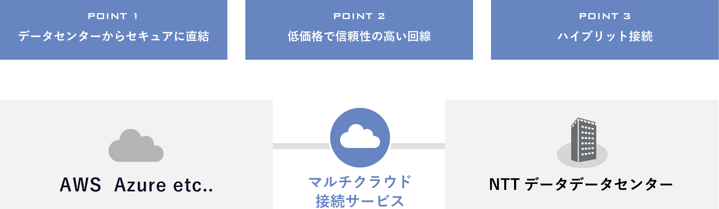 また、各種クラウドサービスとの専用線接続を利用頂くことで、システムやデータ連携をシームレスに行い、よりセキュアで信頼性の高いハイブリッド環境を利用頂けます。