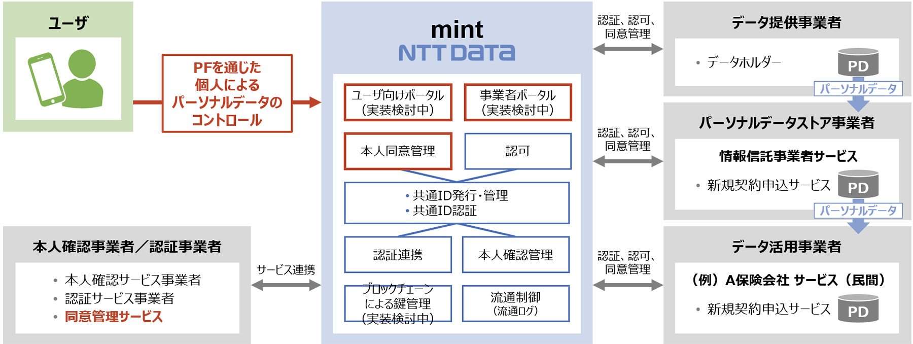mintは、情報銀行に共通な機能を提供し、情報銀行サービスを提供するパーソナルデータストア事業者のシステム開発を容易にします。その共通的な機能の中では、共通IDによる統一的な認証機能を提供すると同時に、情報銀行サービスが利用する認証サービスや本人確認サービスと連携を行い、データ提供事業者、データ活用事業者、パーソナルデータストア事業者(情報銀行)を一元的につなぎます。