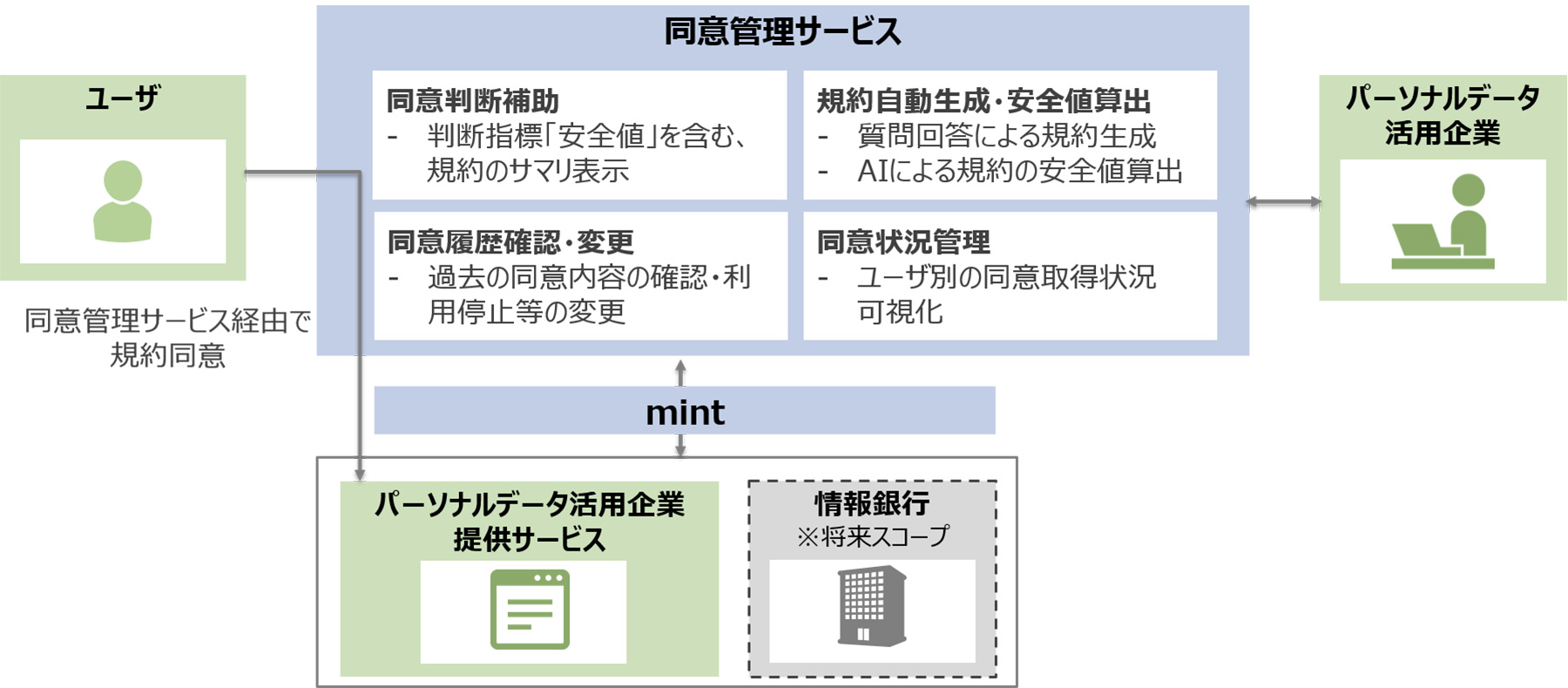 さらに、mintとサービス連携可能な同意管理サービスとして、下図のようなサービスの提供を目指し、実用化に向けた取り組みを行っています。