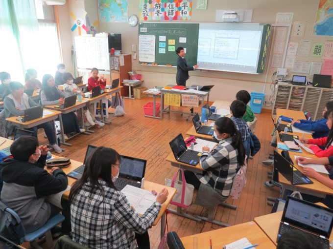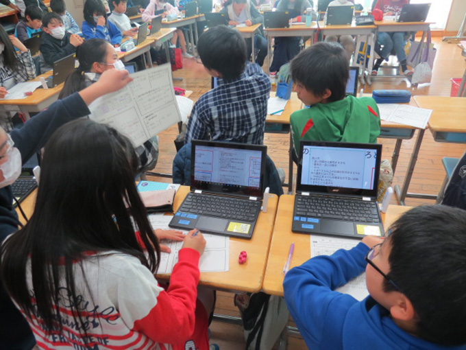 実際の活用においては、Chromebookとインターネットを活用して自ら調べたり意見を書き込んだりできるようにするのに加えて、教材資料や子どもの意見などを表示するために大型提示装置も併用している。ICTモデル校ではこれら機器を活用した授業への取り組みを行っている。