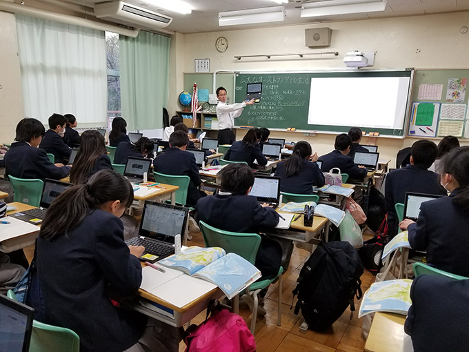 ICTモデル校の堺中学校で行われたChromebookを活用した授業の様子