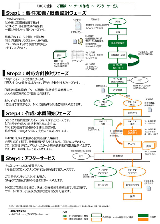 導入に際しては、IT推進部が提供するユーザー部門向けの「EUC(End User Computing)支援サービス」に、RPAのメニューを新規追加した。導入は(1)要件定義・概要設計フェーズ、(2)対応方針検討フェーズ、(3)作成・本番開始フェーズ、(4)アフターサービス、という4つのステップで行われるが、(1)と(2)についてはIT推進部が無償サービスとして実施。(3)と(4)は、IT推進部にシナリオ作成を委託する場合が有償サービス、ユーザー部門で作成する場合は無償サービスとなる。