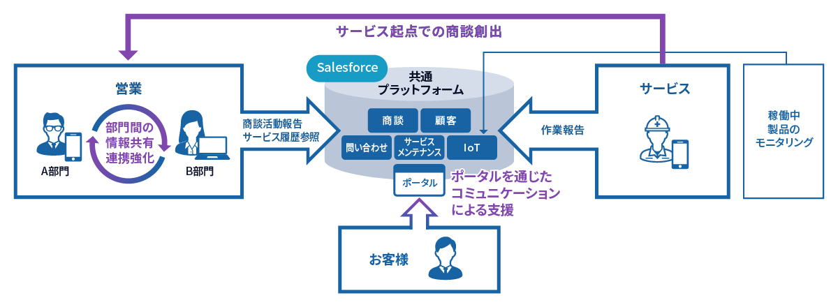 - 保守サービスでの顧客の声を営業部門に還流し、営業プロセスの情報を部門間で共有/連携する事で、サービス起点でのビジネス創出を実現した