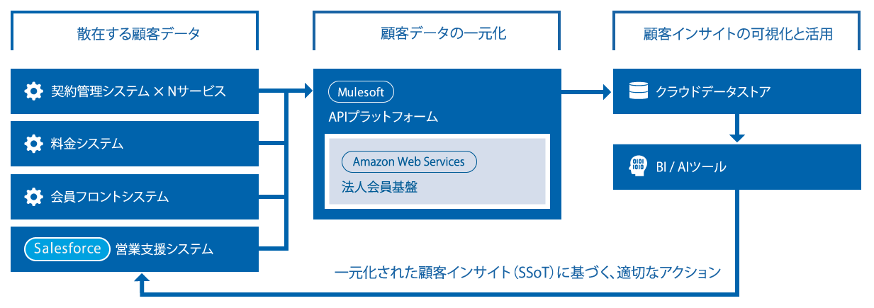 Mulesoftを活用しサービス・システムをAPI連携することで、サービス横断の一元化された顧客情報基盤として利用が可能となり、顧客それぞれ異なる状況・ニーズに即した対応を実現。